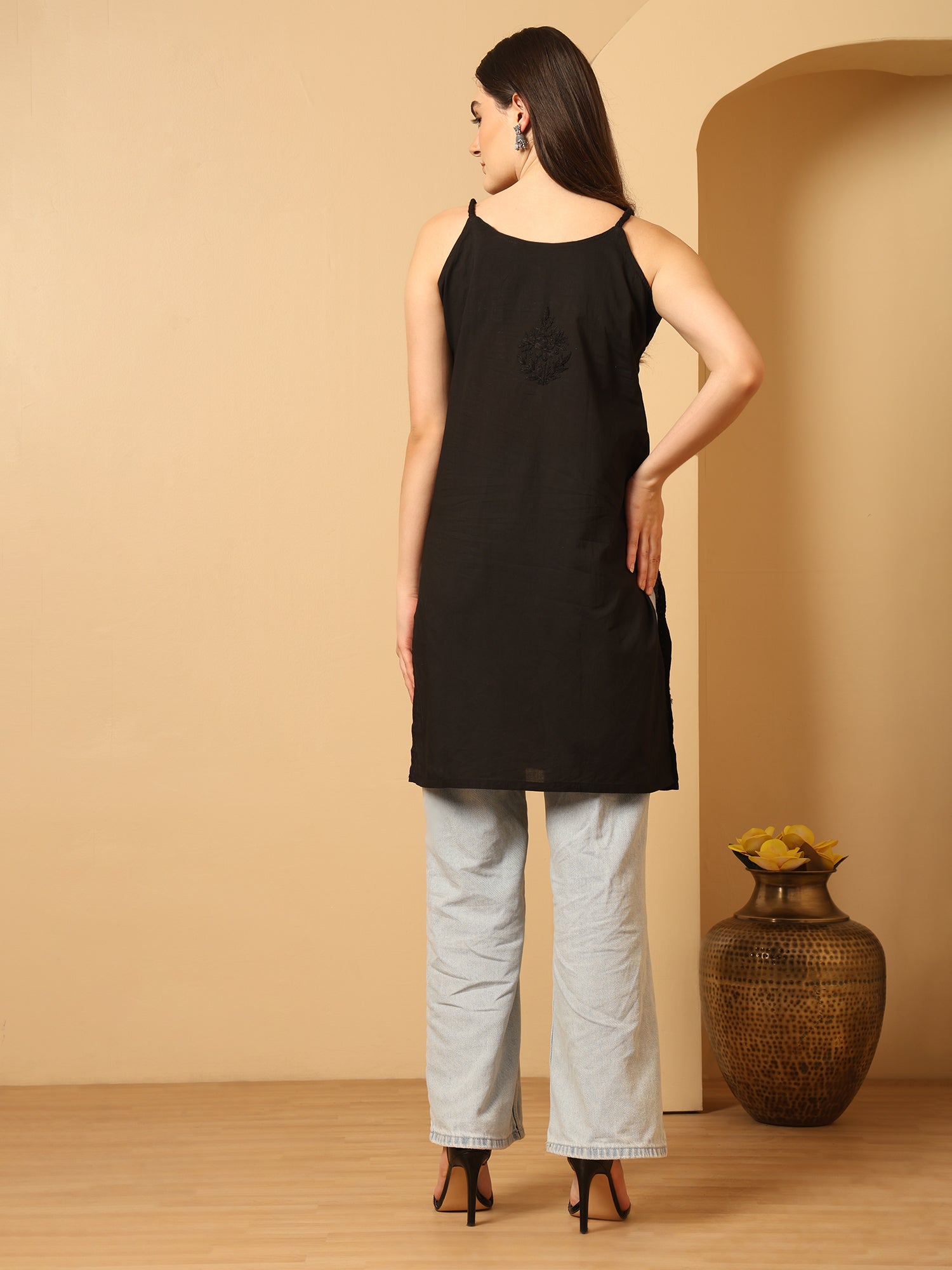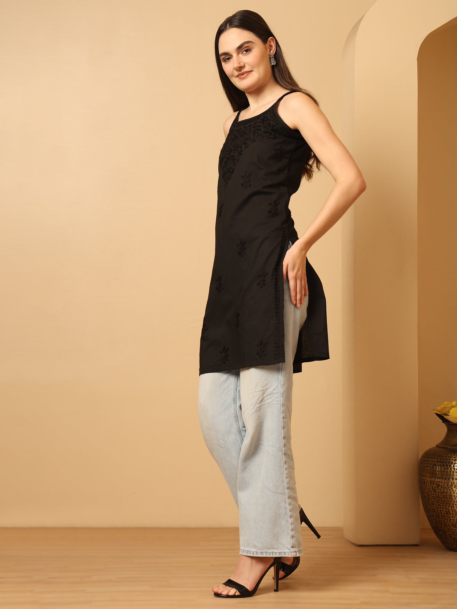 Black Cotton Lucknowi Chikankari Sleeveless Short Kurti for Women with Hand Embroidery – Lightweight Ethnic Wear Top
