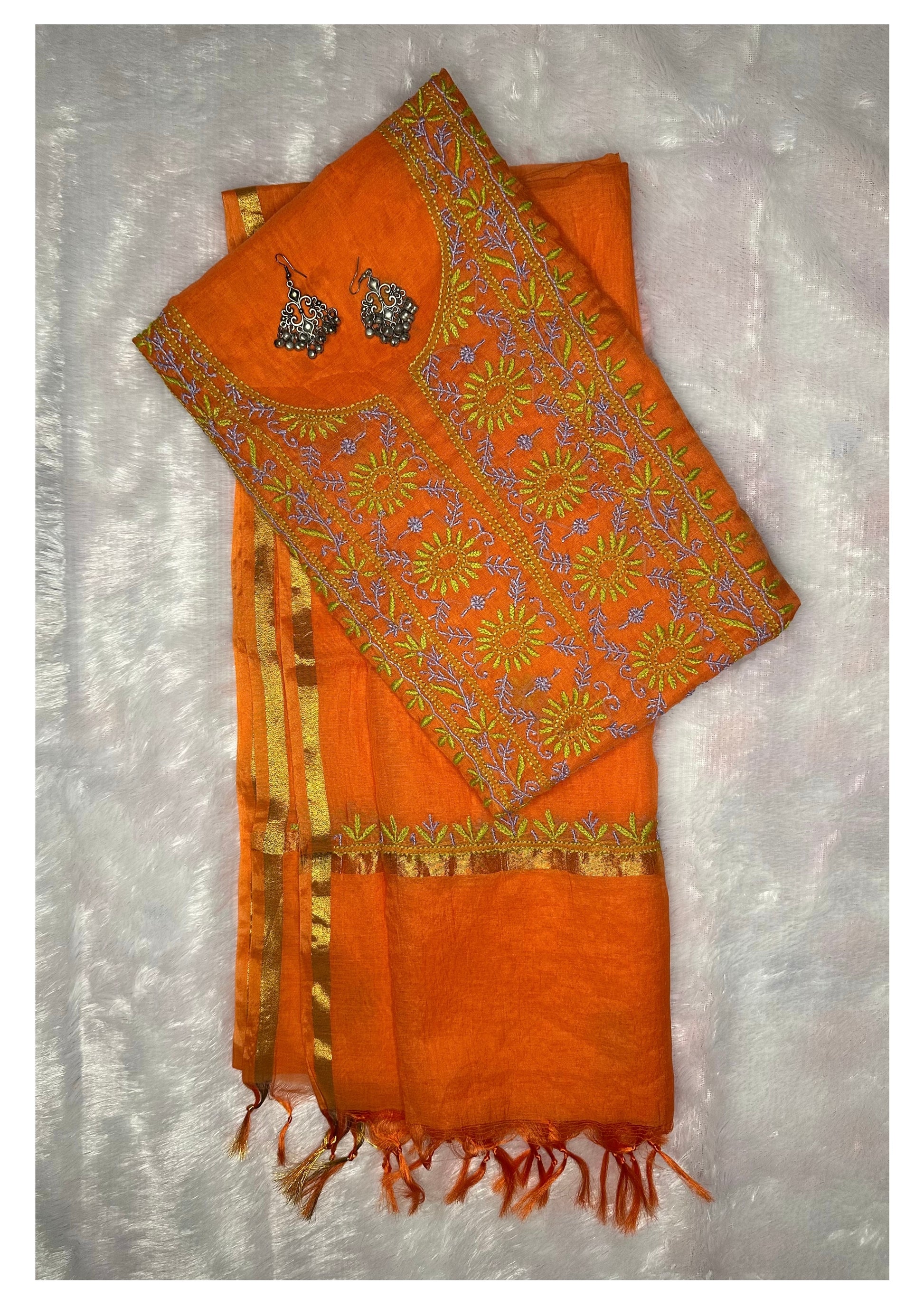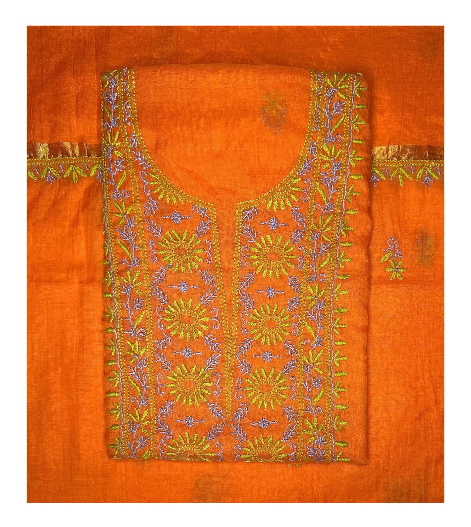 Pure Mul Chanderi Lucknowi Chikankari Unstitched Suit for Women with Dupatta – Hand Embroidered Ethnic Dress Material (2 Piece Set) - Orange